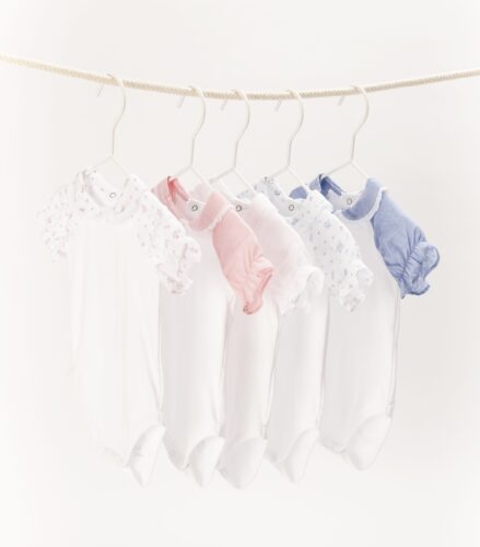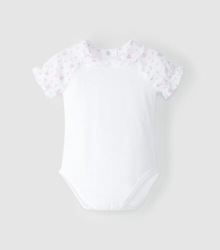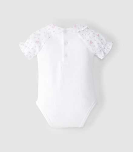 Cotton bodysuit, with sleeves and peter-pan collar in fabric. English embroidery lace detail on the collar. Elastic sleeves. Fastens with poppers at the back and between the legs. Floral Plumeti and plain options.