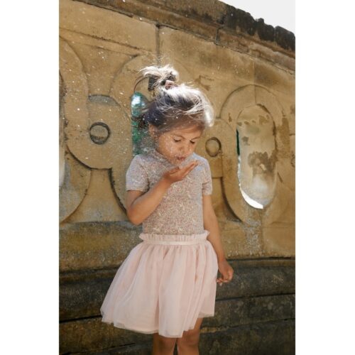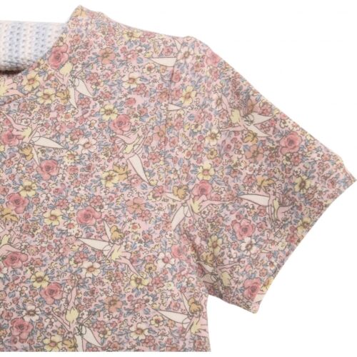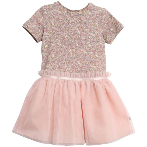 Tinker Bell printed jersey dress with short sleeves and tulle skirt. The dress has a satin detail band at hip. This product is made with organic cotton, and is Oeko-Tex certified.