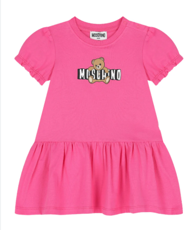 Make a bold statement in this striking azalea pink jersey dress by Moschino. Cut from soft, high-quality cotton jersey, this vibrant piece balances casual comfort with the brand’s signature high-fashion edge. Whether featuring the iconic Teddy Bear or a sleek logo print, its saturated hue ensures it stands out in any wardrobe.