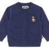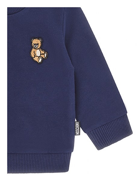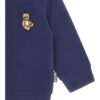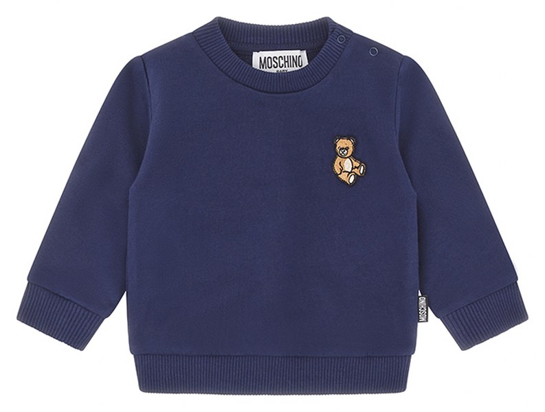 Moschino baby long sleeve navy blue top for younger boys and girls is made from soft cotton jersey. It features the brands iconic teddy bear on the front. It has ribbed neckline and fastens with poppers on one shoulder for easy dressing.