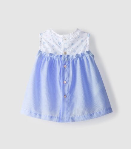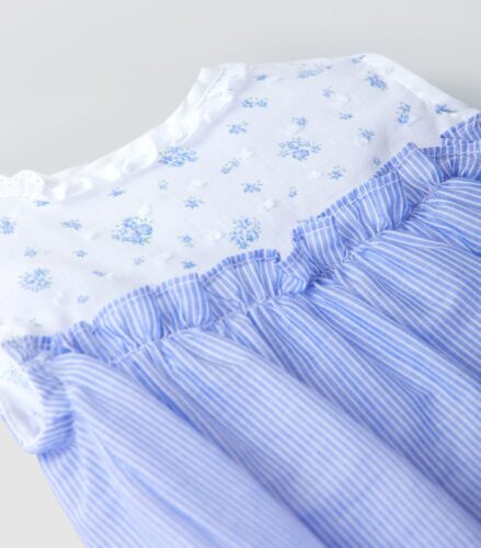 Striped dress with plumeti floral fabric on the chest. Ruffled detail all around. English embroidery lace detail on the neckline. Fastens at the back with “Laranjinha” mother-of-pearl buttons.