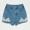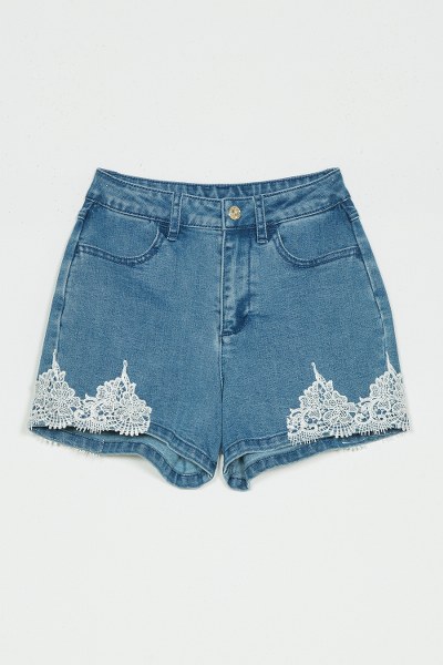 Girls’ stretch denim shorts medium wash with scalloped lace at the hem. Belt loops, zip and logo button fastening, five pockets, matching stitching, straight fit.