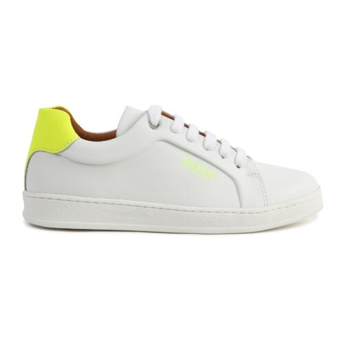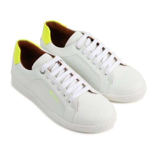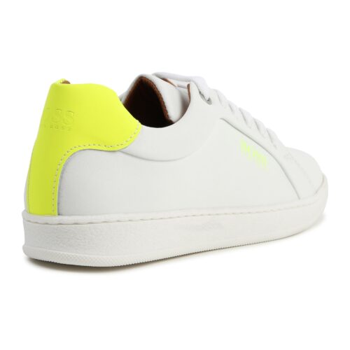 MINI ME white trainers by BOSS Kidswear, made of soft padded faux leather lining and a non-slip rubber outer sole. It has logo print on the side and neon yellow trim on the heal. Desciption:- Faux leather with lining and insole in soft padded faux leather; Lace fastening.